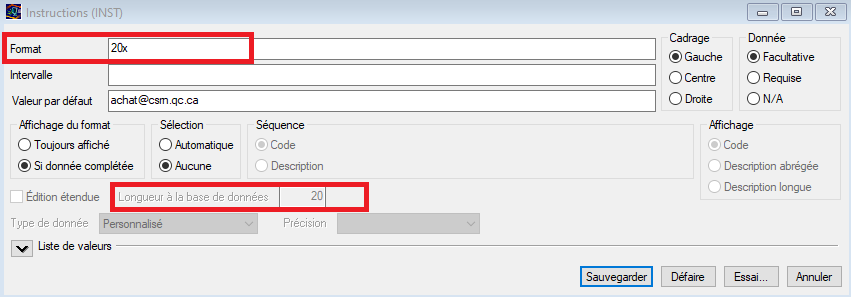 Augmenter le nombre de caractères dans la section Instructions dans la fenêtre Appel d'offres/ demande de prix. Le nombre pour le moment est fixé à 20. On ne peut changer nos adresses courriels suite au passage de .qc.ca vers .gouv.qc.ca