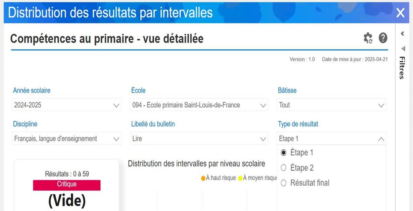 Ajouter la donnée Résultat sommaire de l'élève dans le(s) rapport dVision: Distribution par interval dans le filtre existant: Type de résultat.