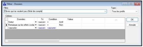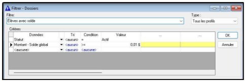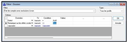 Dans le filtre élève pour l’état de compte du premier du mois, on ajoute un critère