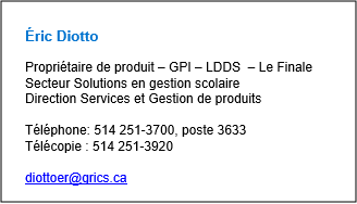 Donc, on comprend que nous avons besoin d'inscrire la donnée au moment de l'inscription et qu'ensuite nous n'avons plus à nous en soucier. C'est pour cette raison qu'il serait bien d'inscrire la donnée à la création du dossier de l'élève immigrant et que cette dernière se reporte les années suivantes.