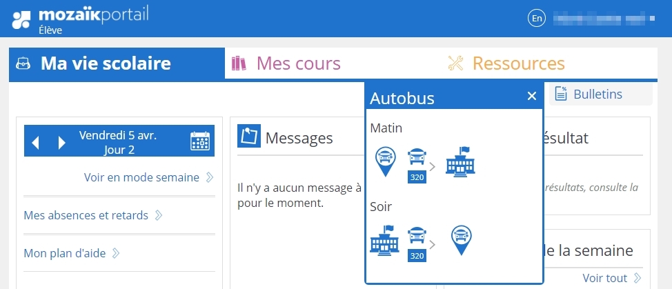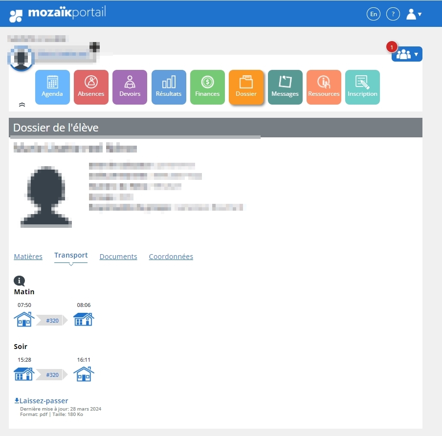 En ce moment une production de Géobus permet d'imprimer une passe d'autobus et de la rendre disponible dans le PortailParents.ca. Il serait vraiment pratique que ce même document PDF soit visible dans Mozaïk-élève. De cette manière l'élève pourrait présenter sa carte au conducteur d'autobus avec son téléphone mobile s'il a oublié son document physique.