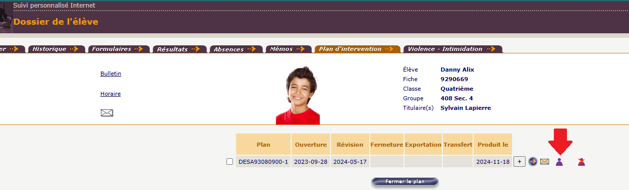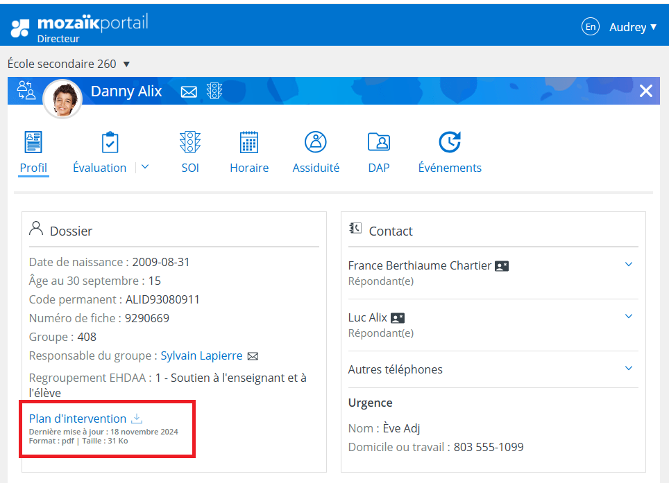 Si le plan d'intervention a été fait avec le canevas national dans le SPI, il est possible de rendre le fichier PDF disponible dans Mozaïk-Portail. Lorsque le PI est partagé aux parents via l'icône de bonhomme mauve dans le SPI, une copie s'ajoute également dans l'onglet Profil du dossier de l'élève.
