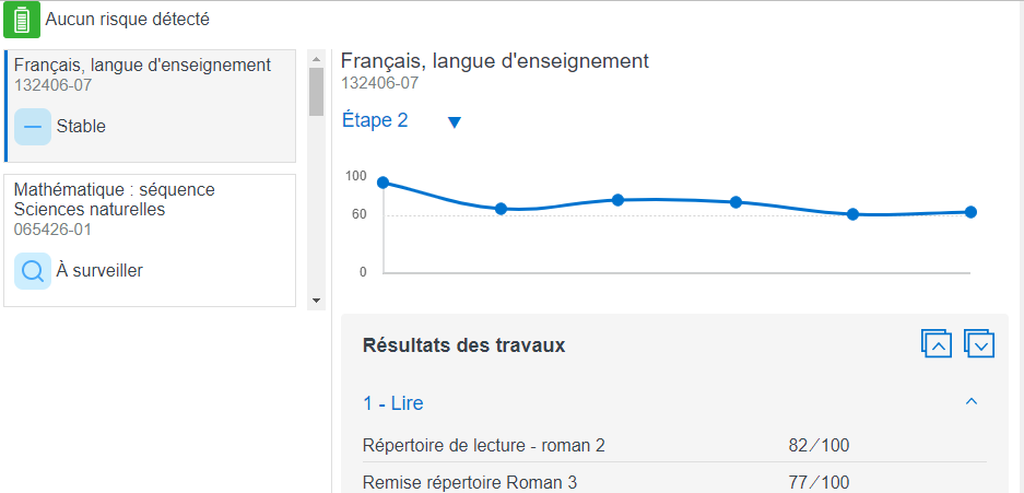 En ce moment, le graphique démontre une courbe pour la matière globale alors qu'il serait intéressant de voir la courbe par compétence pour français et mathématique.