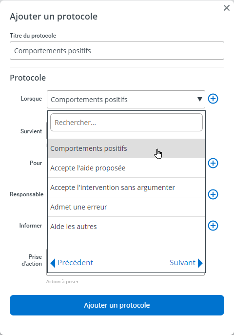 Il est possible de sélectionner une catégorie de comportements (par exemple, les positifs) dans les protocoles automatisés. Il suffit de taper comportements positifs dans la barre de recherche lorsque vous ajoutez un descripteur. Paramétrez ensuite les autres informations.