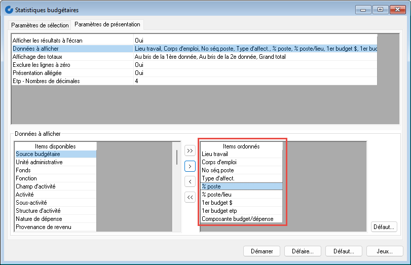Dans GRH > Suivi de la masse salariale > Statistiques budgétaire, à l'onglet Paramètres de présentation, au champ Données à afficher, permettre de monter et descendre (flèche active dans la barre d'outils) les Items ordonnés