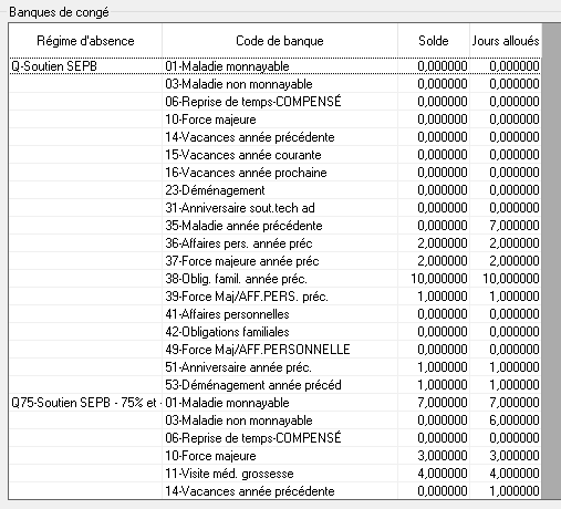 Il serait bien que le régime d'absence actif se retrouve en haut de la liste des régimes d'absence dans la la fenêtre des banques de congé. Il arrive trop souvent que les gens regardent les banques d'un régime d'absence qui n'est plus actif parce que c'est le premier qu'ils voient en haut de la liste au lieu de descendre plus bas et de voir que la personne a vraiment encore dans banques courantes mais dans un autre régime. Donc si le système faisait en sorte de toujours voir celui qui est actif en premier, ça éviterait de la confusion. Merci!